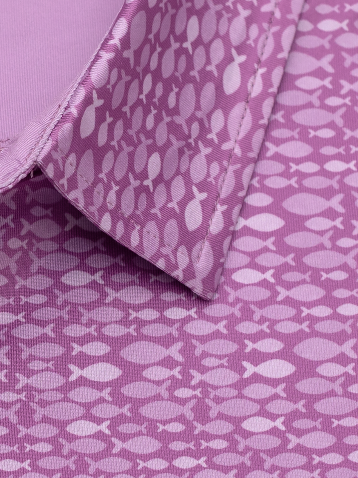 The modern geometric pattern and vibrant pink tones bring a fresh, confident edge to your wardrobe. Whether you're on the course, at brunch, or in the office, this polo delivers all-day comfort and effortless flair.