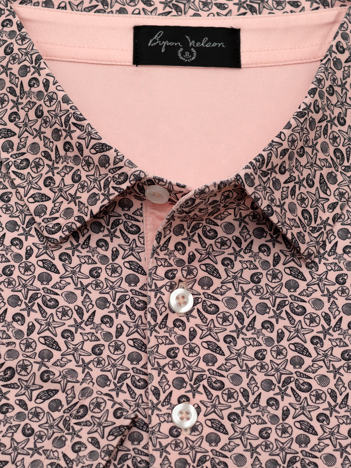 Bring beachside vibes to the course or the clubhouse with the Shell Yes Polo in Pink Sand. Featuring an intricate all-over seashell and starfish pattern in bold black, this polo is a laid-back nod to coastal cool. The soft pink backdrop adds a fresh, modern twist, while the lightweight fabric and breathable design keep you comfortable wherever the day takes you.